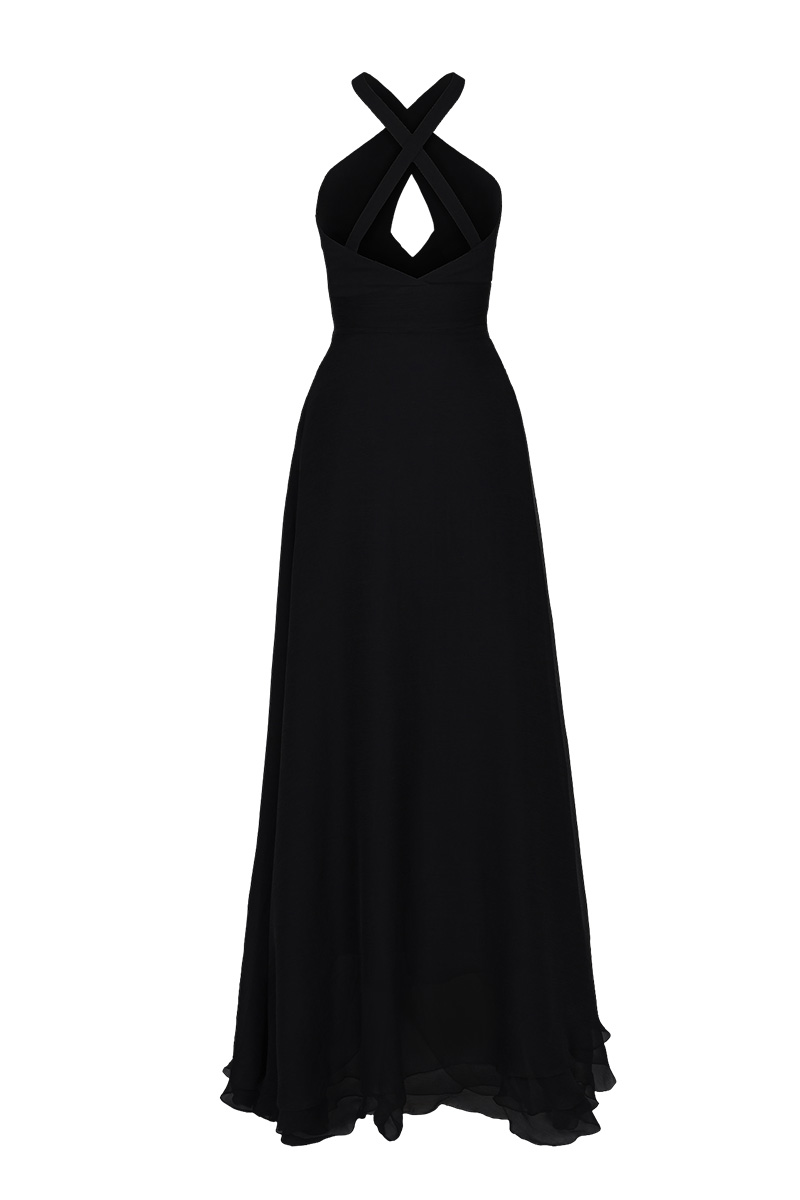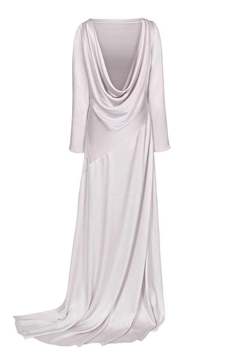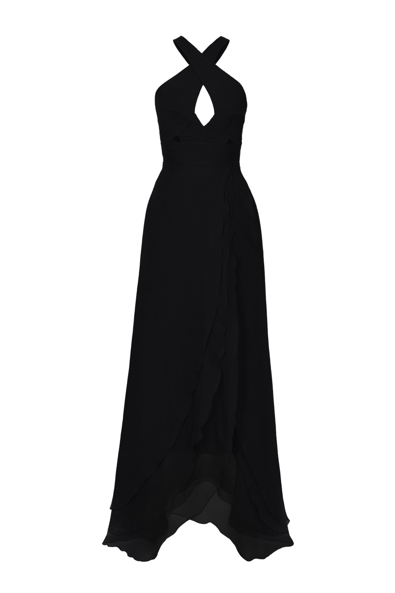 Floor-length ball gown crafted from an exclusive sequin fabric with a radiant, shimmering finish. Featuring a deep V-neckline, elegant halterneck with hook closure, open back, high side slit, and a flowing train. Fully lined in viscose and precisely tailored. Made in Italy.