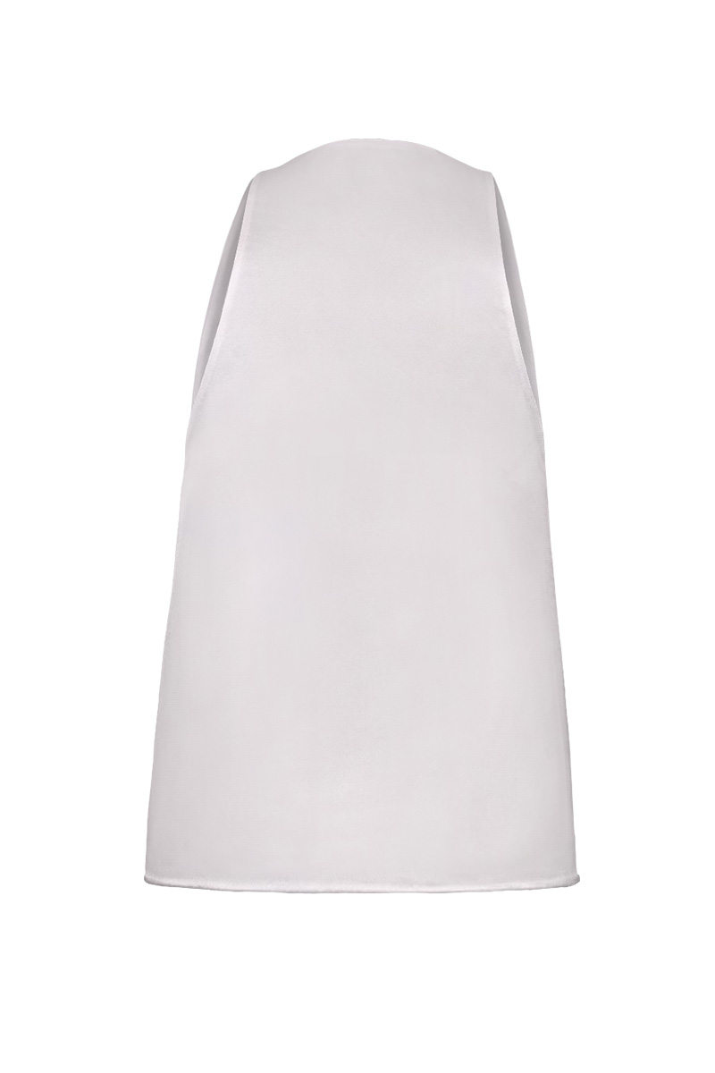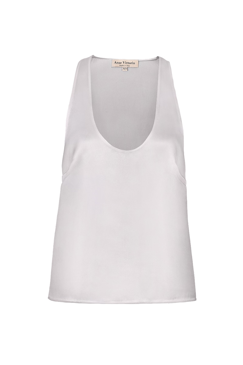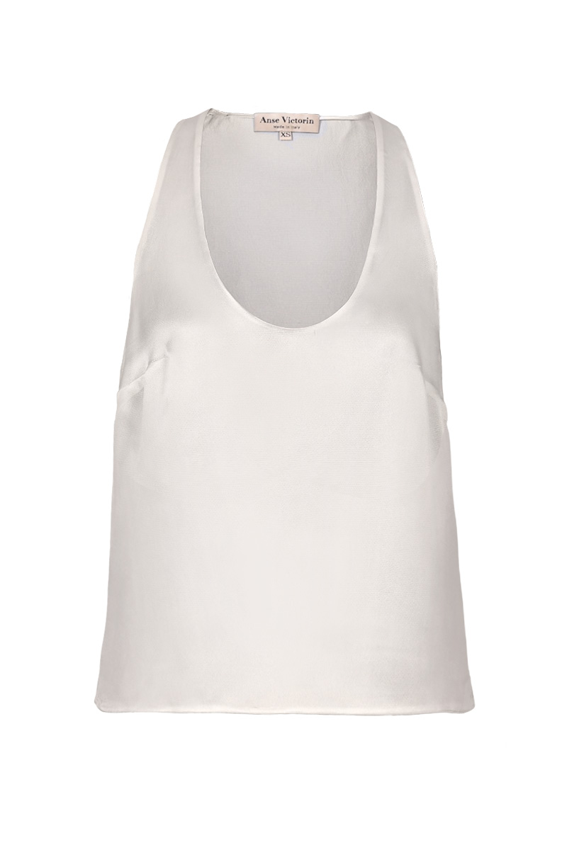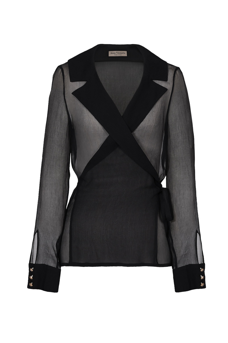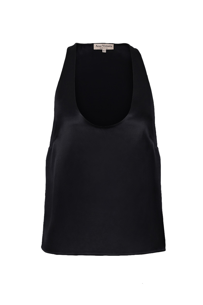 Sophisticated halterneck crop top made from silk chiffon crepe with side flounces and a hand-embroidered AV-Motif. Lined with silk jersey.