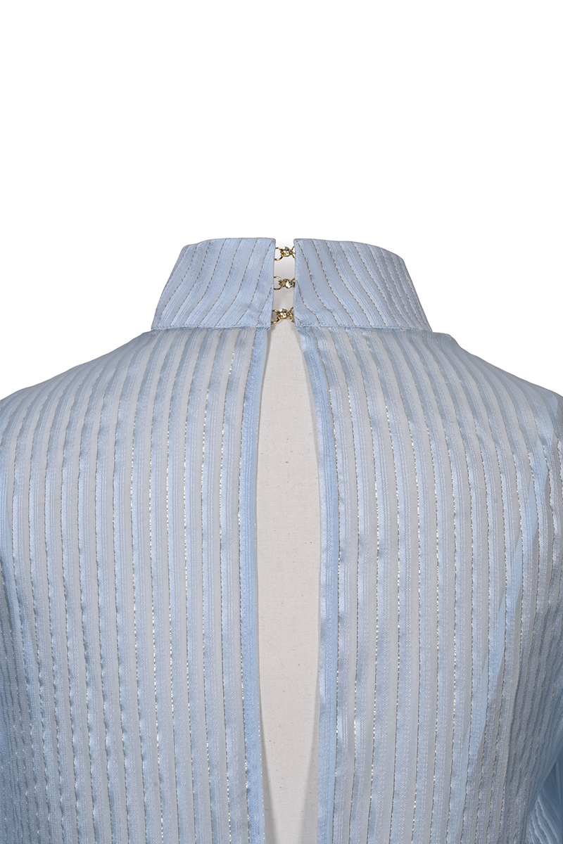 Dieses hochgeschlossene Minikleid in zartem Hellblau besticht durch seine elegante Leichtigkeit und luxuriöse Materialien. Gefertigt aus feinem, halbtransparentem Seidenchiffon, verleiht es dem Look eine moderne, sinnliche Note. Der gerade Schnitt, der Stehkragen und die langen Trompetenärmel sorgen für eine klare, stilvolle Silhouette.