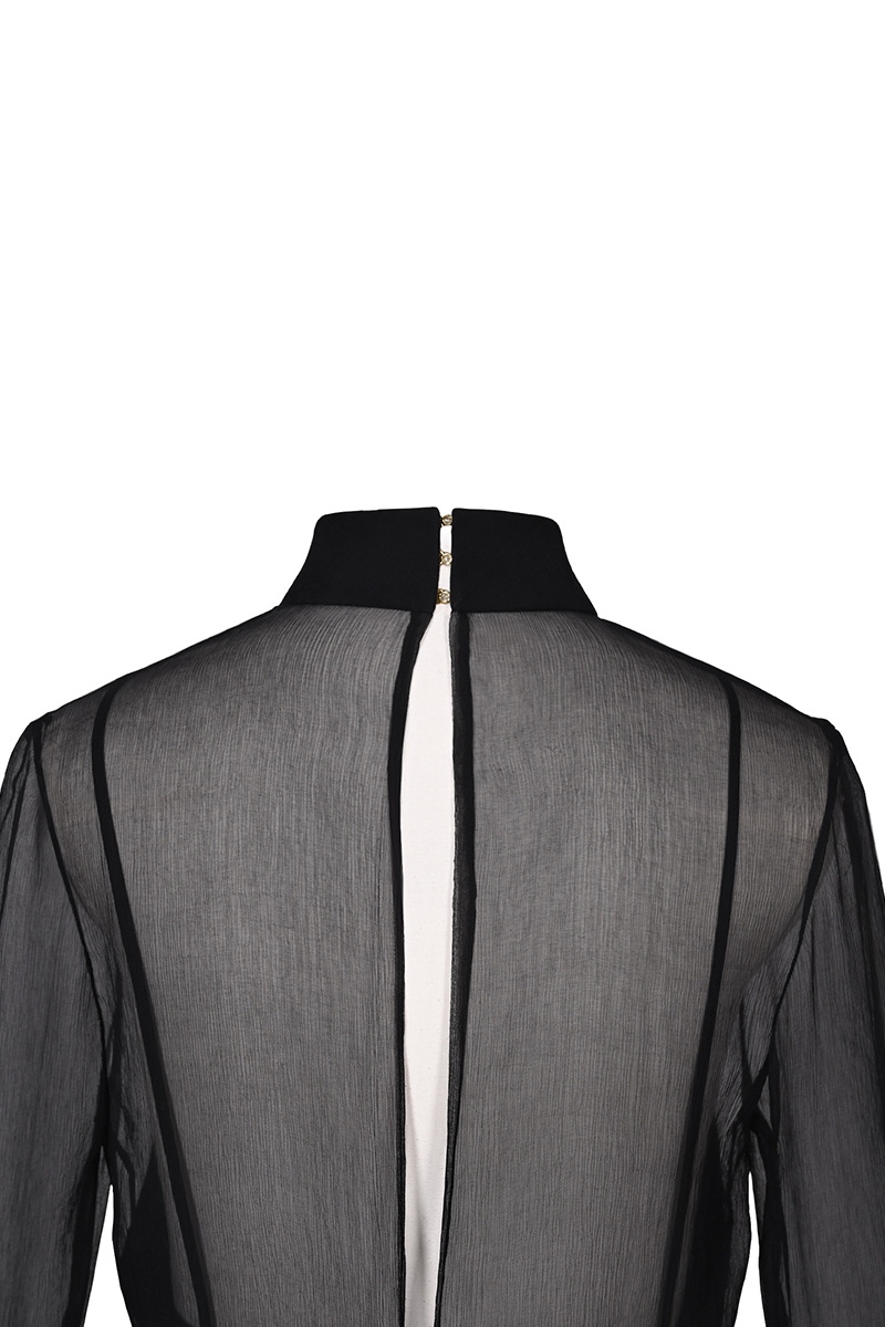 Dieses hochgeschlossene schwarze Minikleid besticht durch seine elegante Leichtigkeit und luxuriöse Materialien. Gefertigt aus feinem, halbtransparentem Seidenchiffon, verleiht es dem Look eine moderne, sinnliche Note. Der gerade Schnitt, der Stehkragen und die langen Trompetenärmel sorgen für eine klare, stilvolle Silhouette.